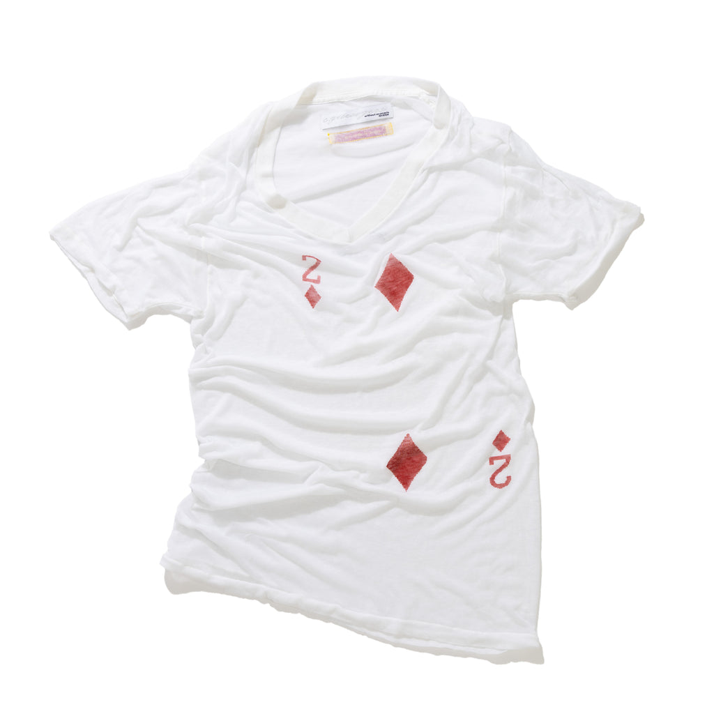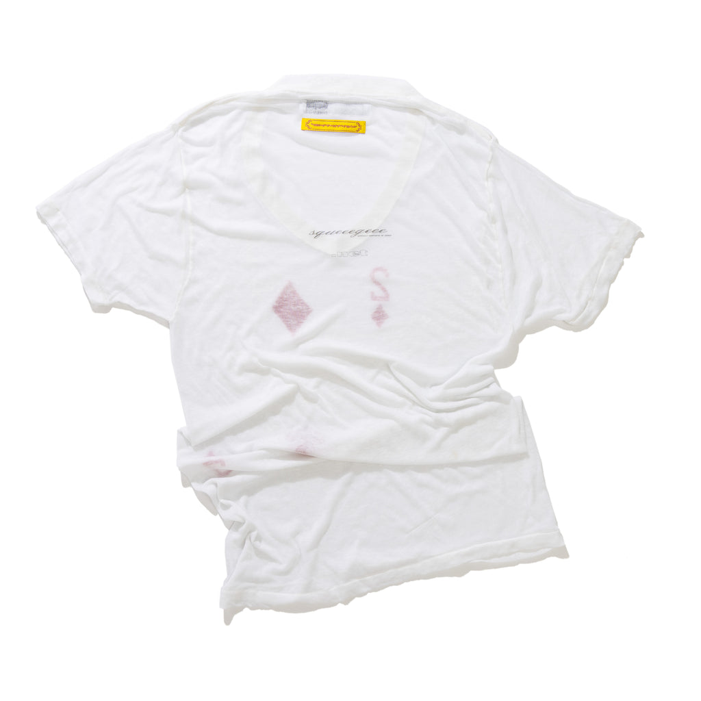 squeeegeee presents the squeee neck. The v-neck t-shirt. An often overlooked and underestimated garment. The squeee neck conveys a sense of buoyancy and leisure. All shirts have a past life: yellowing, stains, warping, cracking and fraying simply make the product richer. The style is so casual it seems enlightened. Carefully careless. Hand-printed in Los Angeles with feelings, mistakes and emotions. Each one is unique.