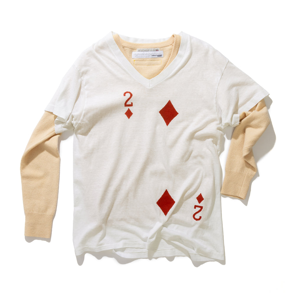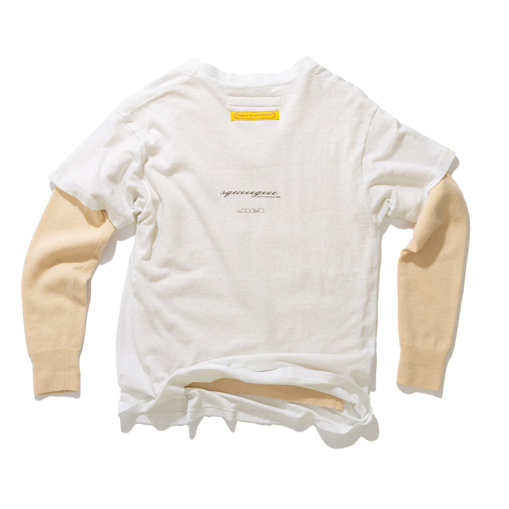 squeeegeee introduces the polarity sweater. A two layer item that combines the squeee-neck t-shirt permanently fixed to a 100% cashmere sweater. These two unique pieces are held together by a single thread, connected by a deconstrct yellow lurex label at the nape of the neck. This structure allows a unique flow and offers the wearer the opportunity to admire each element in its entirety. Intrigued by the dichotomy of each garment, squeeegeee looks to the future. Combining the grandmotherly essence of a blank cashmere with an LA sunny staple. The v-neck t-shirt is an often overlooked and underestimated garment. The squeee neck conveys a sense of buoyancy and leisure. All shirts have a past life: yellowing, stains, warping, cracking and fraying simply make the product richer. The style is so casual it seems enlightened. Carefully careless. Hand-printed in Los Angeles with feelings, mistakes and emotions. Each one is unique.