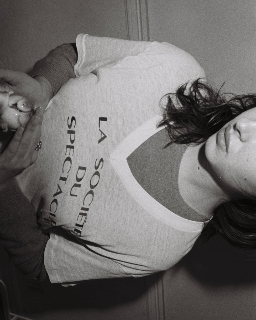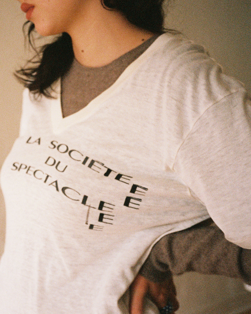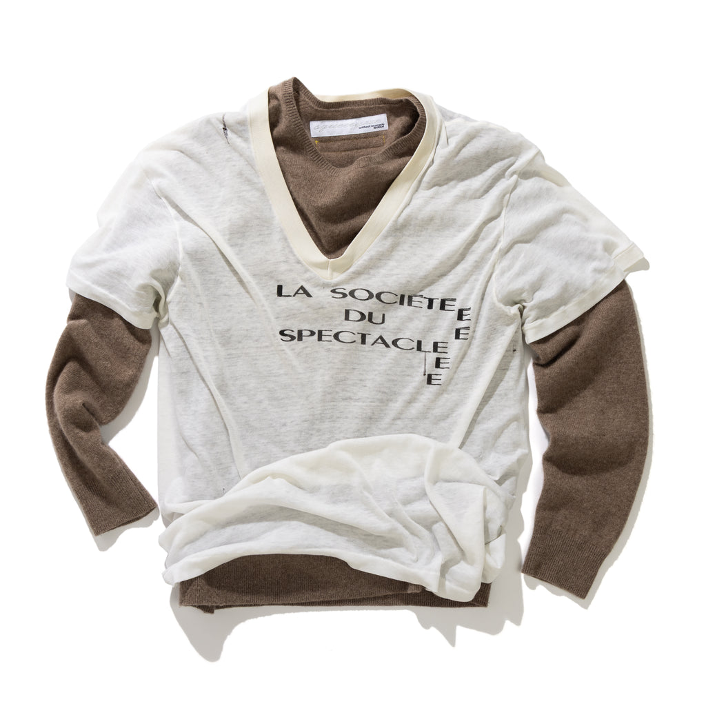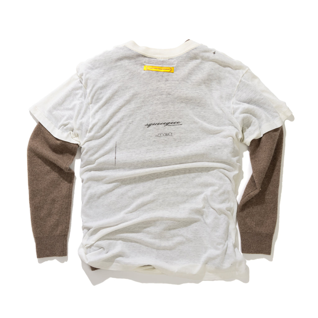 squeeegeee introduces the polarity sweater. A two layer item that combines the squeee-neck t-shirt permanently fixed to a 100% cashmere sweater. These two unique pieces are held together by a single thread, connected by a deconstrct yellow lurex label at the nape of the neck. This structure allows a unique flow and offers the wearer the opportunity to admire each element in its entirety. Intrigued by the dichotomy of each garment, squeeegeee looks to the future. Combining the grandmotherly essence of a blank cashmere with an LA sunny staple. The v-neck t-shirt is an often overlooked and underestimated garment. The squeee neck conveys a sense of buoyancy and leisure. All shirts have a past life: yellowing, stains, warping, cracking and fraying simply make the product richer. The style is so casual it seems enlightened. Carefully careless. Hand-printed in Los Angeles with feelings, mistakes and emotions. Each one is unique.