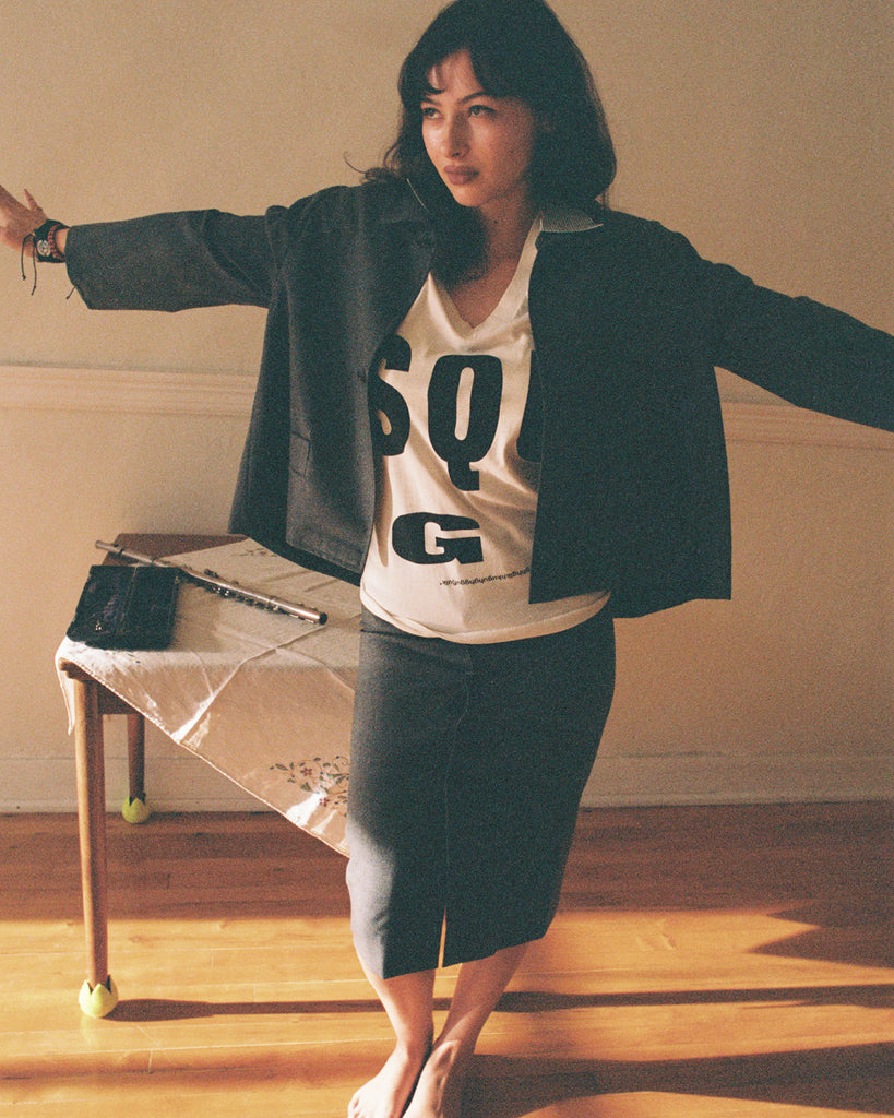 The squeee neck conveys a sense of buoyancy and leisure. All shirts have a past life: yellowing, stains, warping, cracking and fraying simply make the product richer. The style is so casual it seems enlightened. Carefully careless. Hand-printed in Los Angeles with feelings, mistakes and emotions. Each one is unique.